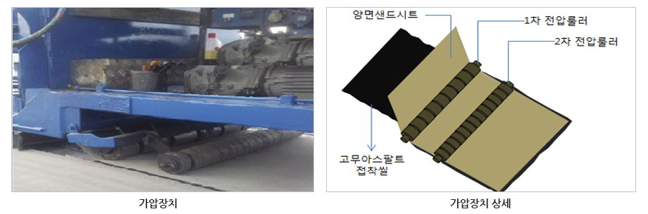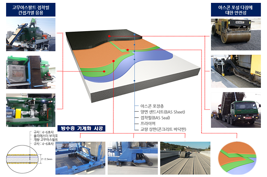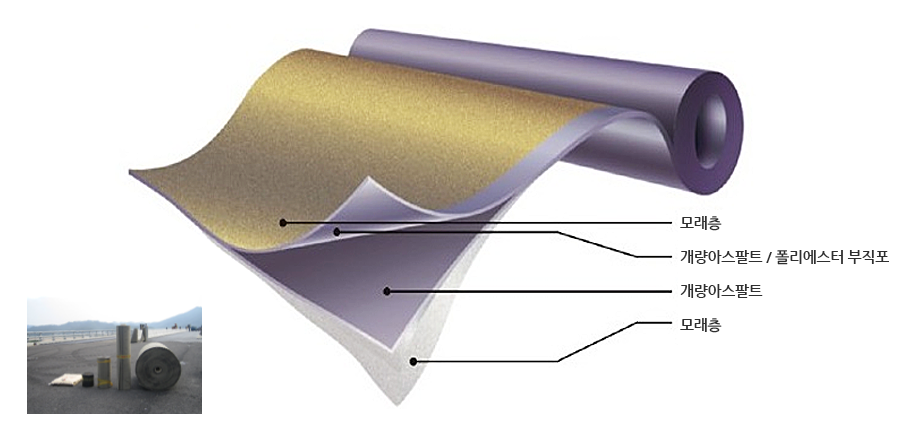 시트양면에 규사살포로 전단저항성 향상, 통기성 확보(에어포켓 배제)개량아스팔트 사이 중심기재 형성으로 시트 보강 및 아스콘 골재 관입방지