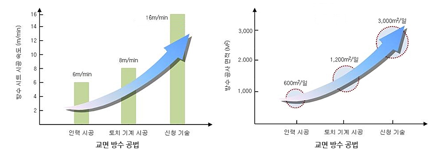 기계화 시공에 따른 균질의 등방성 방수층 형성으로 인력시공 대비 2배 이상의 성능향상| 구분 | 기준 | 인력 시공 구간 | 기계화 시공 구간 |