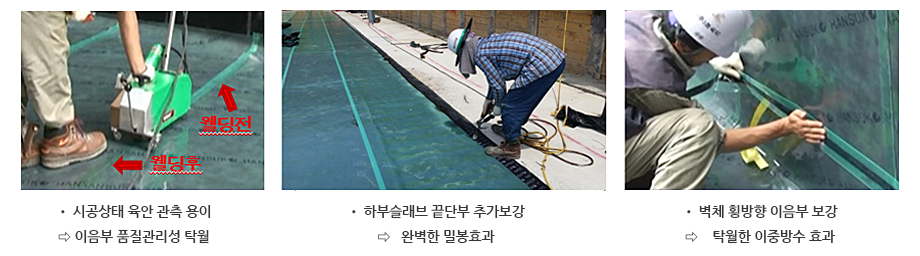 - 일반 자착식 시트는 단순히 인력에 의한 가압압착의 1차이음 만으로 시공이 완료되나 본 공법은 완전방수를 실현하기 위하여 자동 열풍융착기로 EVA층을 추가로 2차 접합 이음함으로써 2중 방수구조의 완벽한 수밀성을 확보하였다.